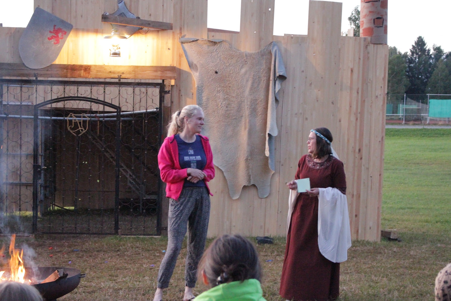 Bij aankomst werden de kinderen verwelkomd door ons, de leiding, in kostuums van ridders, prinsessen en draken. Het thema van dit jaar was namelijk: “Iemand moet de draak doden!” De kinderen mochten ook verkleed komen en het kampterrein leek daardoor meteen op een sprookjesachtig middeleeuws dorp.