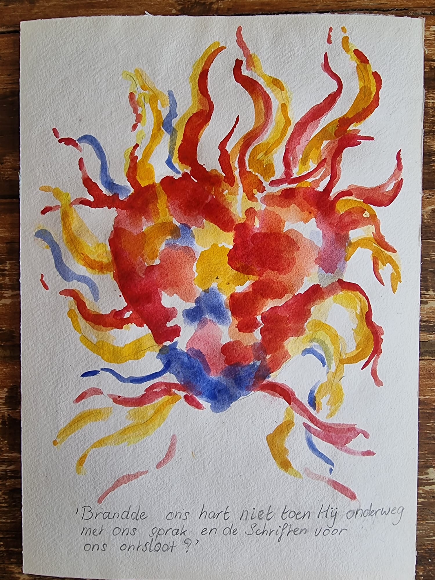 "Trix leest één keer in de twee weken op donderdagochtend Bijbel met een aantal vrouwen. Het is mooi om te merken hoe dit wordt gewaardeerd en hoe men ernaar uitkijkt. We zijn vóór de Pasen begonnen met de lijdensverhalen in Lukas en lezen nu verder in Handelingen, over het ontstaan van de kerk. Een vrouw doorzag scherp hoe de Heilige Geest zorgt dat het Evangelie doorgaat, de wereld in, ondanks tegenslag. De vrouwen stellen veel vragen en voelen zich vrij om te delen over ieders leven. Steeds weer zien we hoe sterk God spreekt tot een ieders leven en hoe relevant de Bijbel vandaag de dag nog steeds is. Door de regelmaat en openheid ontstaat er iets moois, een gemeenschap die we allen nodig hebben. We bidden voor elkaar en wat ons bezig houdt. De sfeer is goed. Eerst wilden de deelnemers graag een grotere groep, maar de laatste keer constateerden we met elkaar dat het goed is zoals het is. Groei is welkom, maar geen voorwaarde. Hoewel in de schoolvakantie de activiteiten van Proef! op een laag pitje staan, gaat het Bijbellezen door. En daar zijn ze dankbaar voor," schrijft Edward. Het schilderij hierboven is gemaakt door één van de deelnemers van de Bijbelstudie